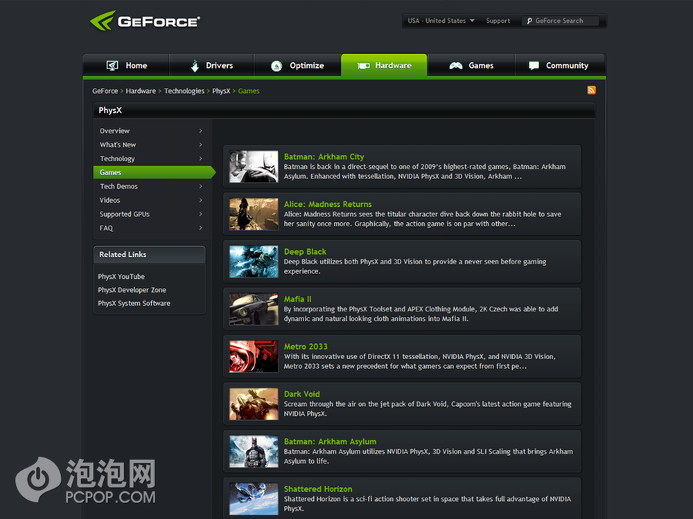 NVIDIA在游戏界有着举足轻重的影响力,和众多游戏开发商保持着密切的合作关系,大名鼎鼎的“The Way”计划就保证了N卡在几乎所有游戏大作中都有着良好的性能发挥。PhysX物理引擎被NVIDIA收入囊中之后,原本屈指可数的物理游戏逐渐开花结果,以《镜之边缘》、《蝙蝠侠》、《黑暗虚空》为代表的一些重量级大作开始使用PhysX物理引擎,影响力非同小可。7/19