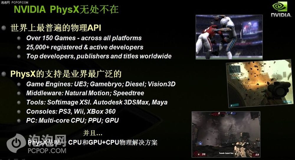 Ageia公司因此一夜成名,霎时成为了业界关注的焦点。而ageia的竞争对手也被Intel收购,向来财大气粗的NVIDIA公司为了在显卡上实现硬件物理加速,于2008年初将Ageia公司并入囊中,从此GPU硬件物理加速时代来临。4/19