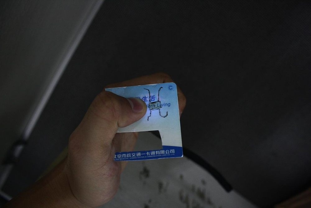 折断的公交卡一位着20元押金没有了,正好卡里也没钱,就准备自己DIY一个mini卡。上图我们可以看到通过手电的照射,能够看到公交卡里的芯片。5/10