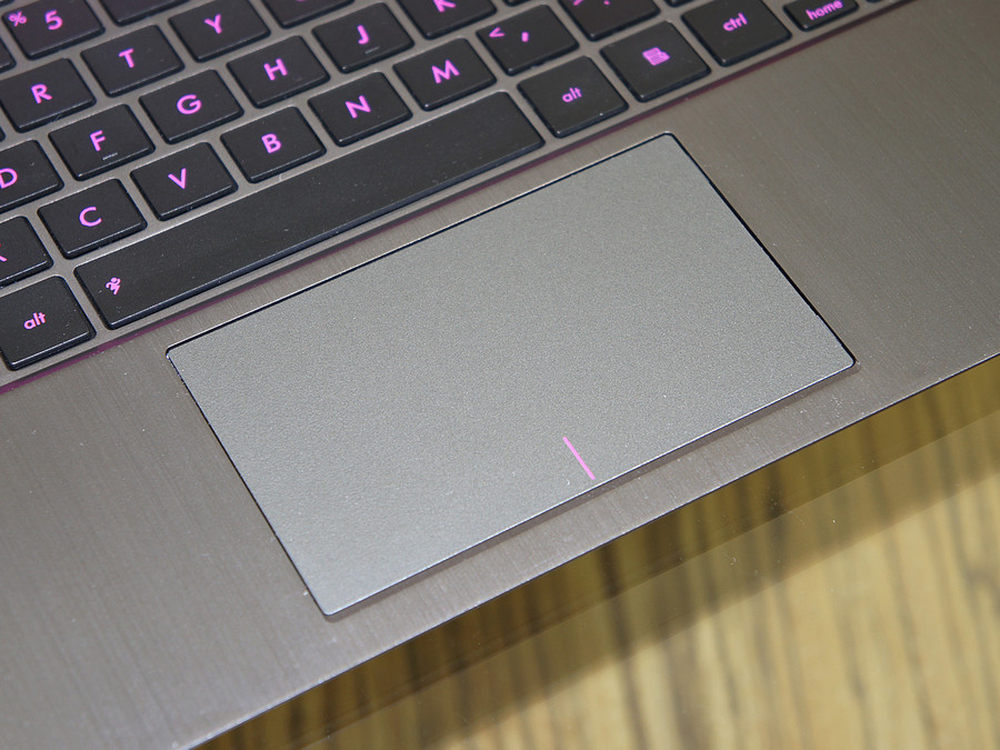 触控板方面虽然没有什么大的变化,但是我们还是能够找到细节上的区别,一体式按键的分割线变成了粉色。10/21