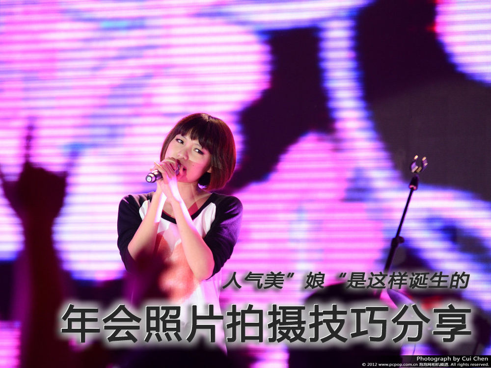 在拍摄中,我们除了要善用外置闪光灯,同时我们还可以不用闪光灯,充分利用年会现场舞台的灯光来拍出别具一格的照片。