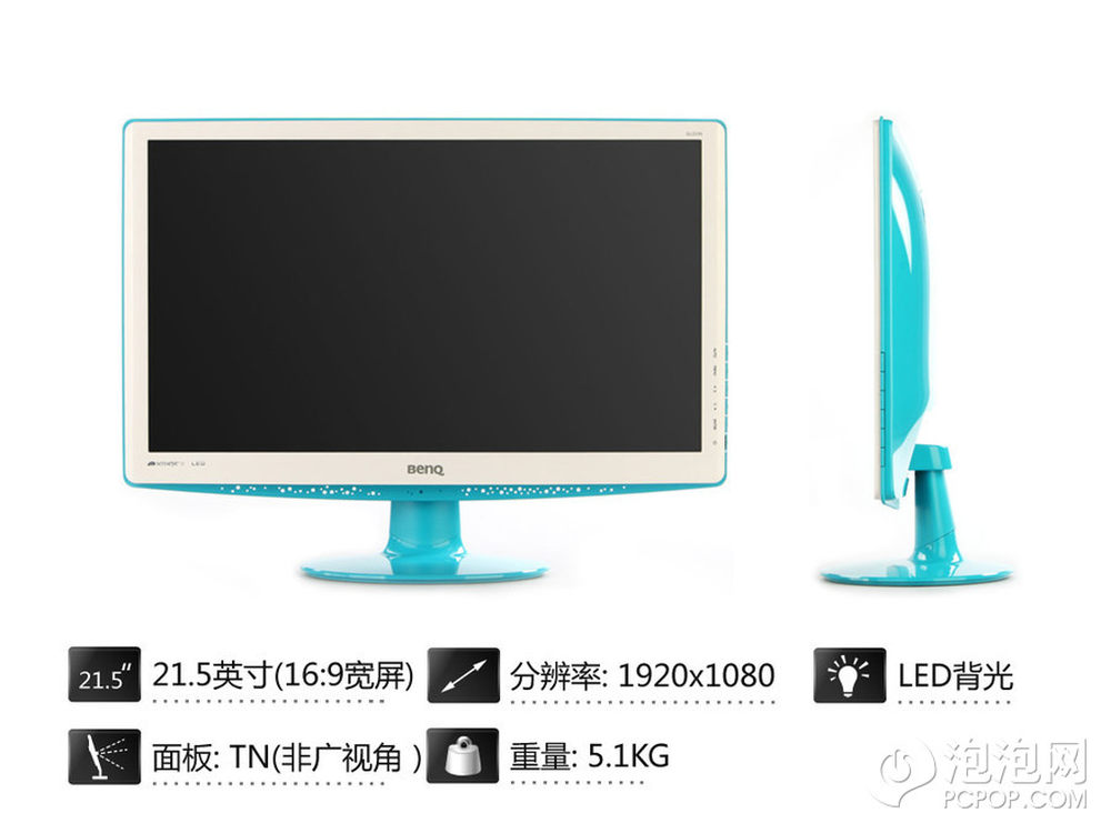 明基GL2230M是新年伊始的一款新品21.5吋LED液晶,自然分辨率是1080P的全高清。它其实是年底前明基发布会上所传达的糖果套装系列中的产品,也正因为此,才不是我们常见的通身黑色,而是正面白皙,侧面和背部则以淡蓝色包裹。2/15