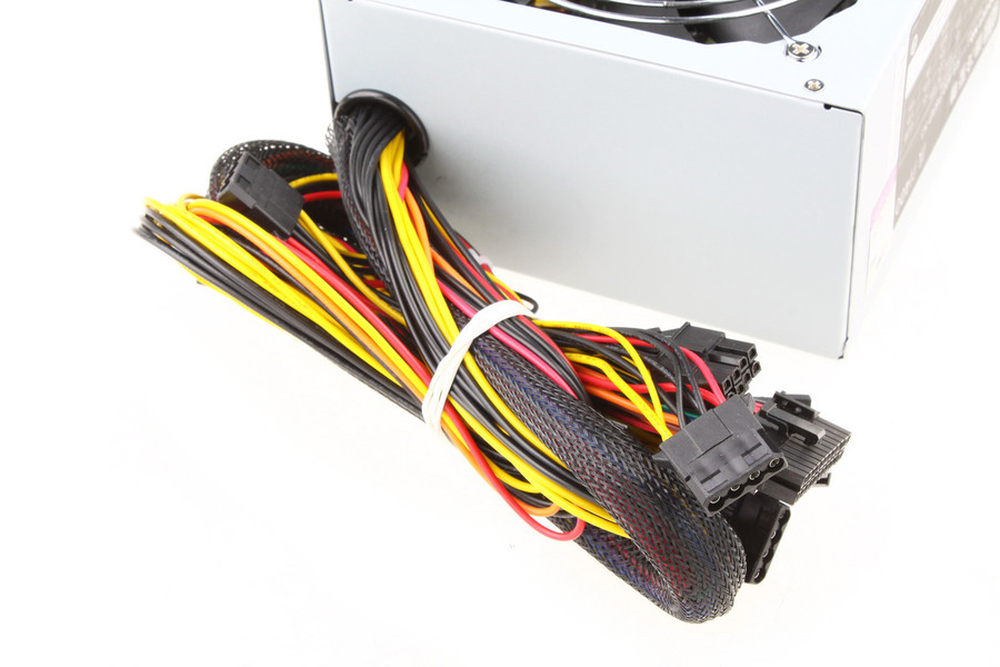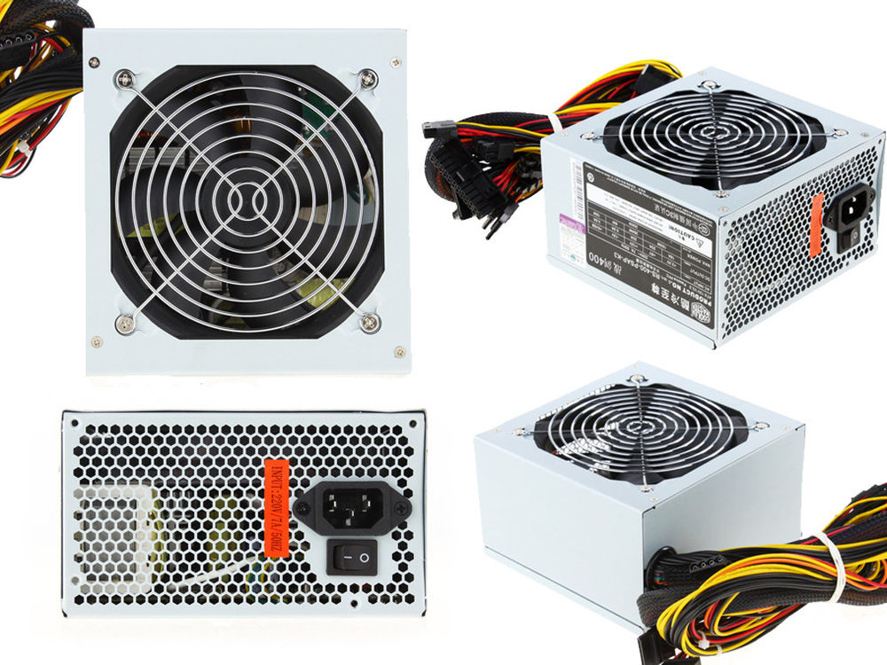 其实电源的外观和酷冷很多入门级电源很像,灰色锌钢壳加上12cm黑色风扇,从散热孔一侧还可以看到一大颗被动的PFC电感,电源的线材只有24PIN包裹的尼龙网,交流电的总开关没有省略,这一点让人欣慰。4/13