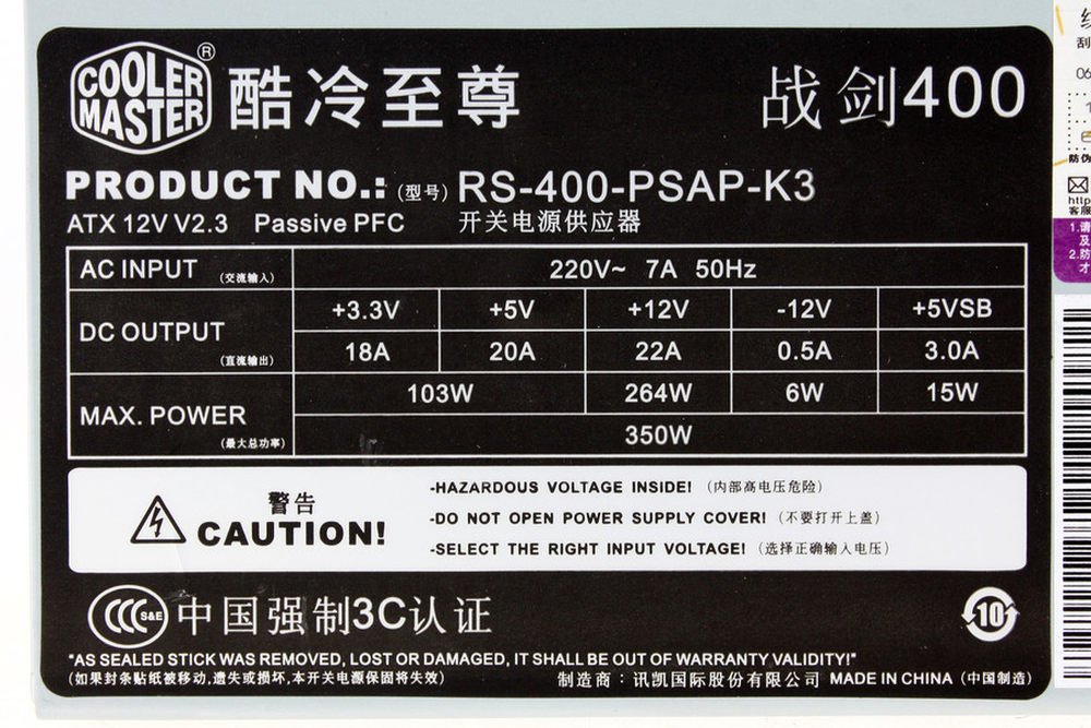 电源的额定功率为350瓦,但是名称中出现的数字有400,在功率贴纸上也没有出现包装盒上宣传的峰值460瓦,我又咽下一口吐沫……5/13