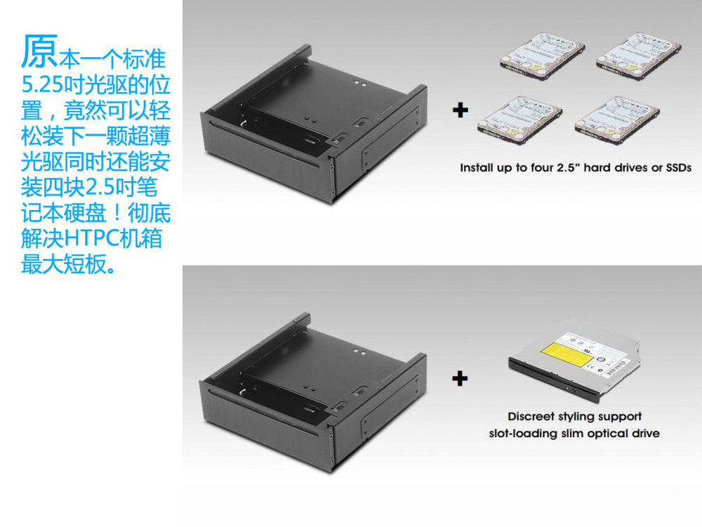 看上去只是简单的一个支架却可以完美兼容四块硬盘与一台光驱,确实神奇。不过最大的问题是散热,如果真的将四块光驱挤在一起,热量如何发散将成为最重要的问题,所以小编并不推荐塞满。相比不同机箱它更是适合HTPC用户,以解决捉襟见肘的硬盘仓。
