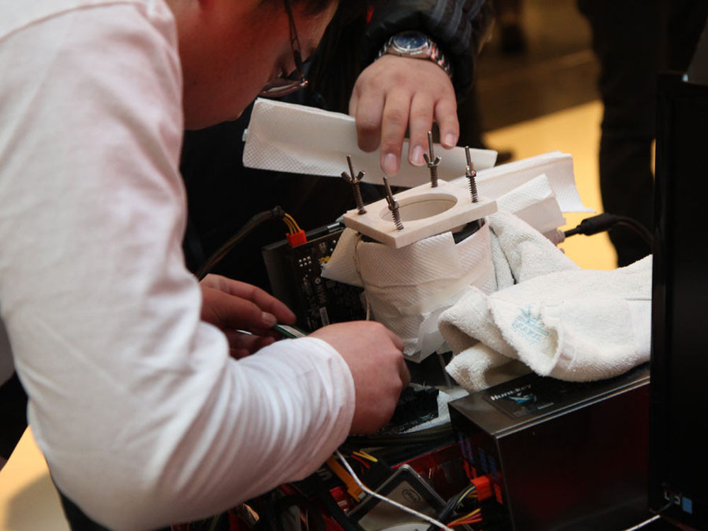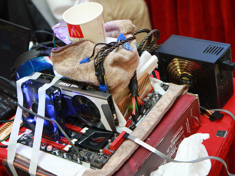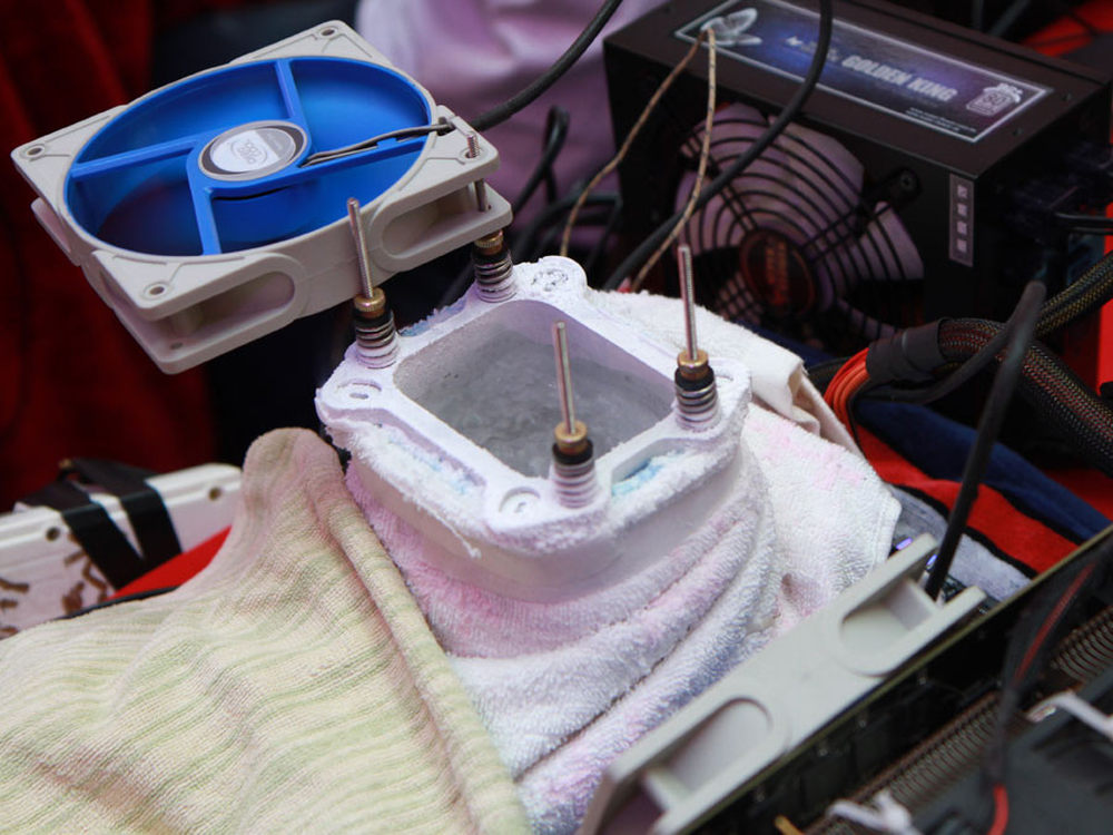 比赛分为三个环节,分别是显卡常规超频、CPU水冷超频和CPU极限超频。图为选手在精心搭建平台,可以看到蒸发皿(俗称大炮)周围缠满了纸巾、毛巾等来吸收水分,防止短路。7/14