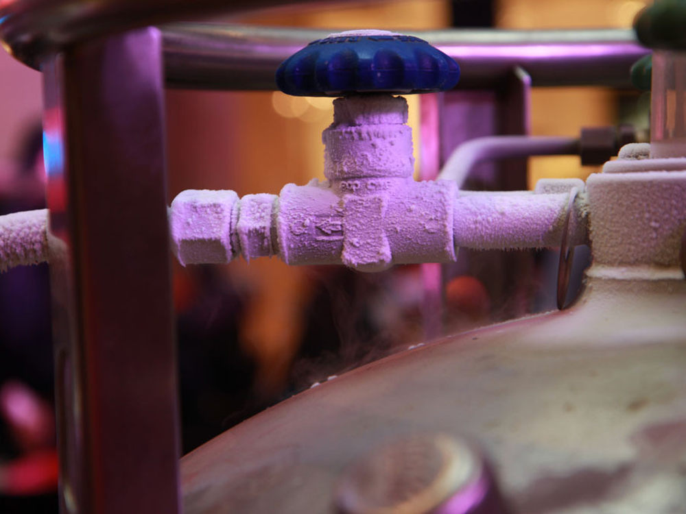 前面提到了液氮的温度低至-193℃,在液氮罐的阀门处结起白霜。11/14