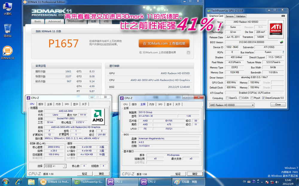 成功开启双卡混交模式后,3DMark 11成绩达到P1657分,相比单显卡下提升了40%%。19/19