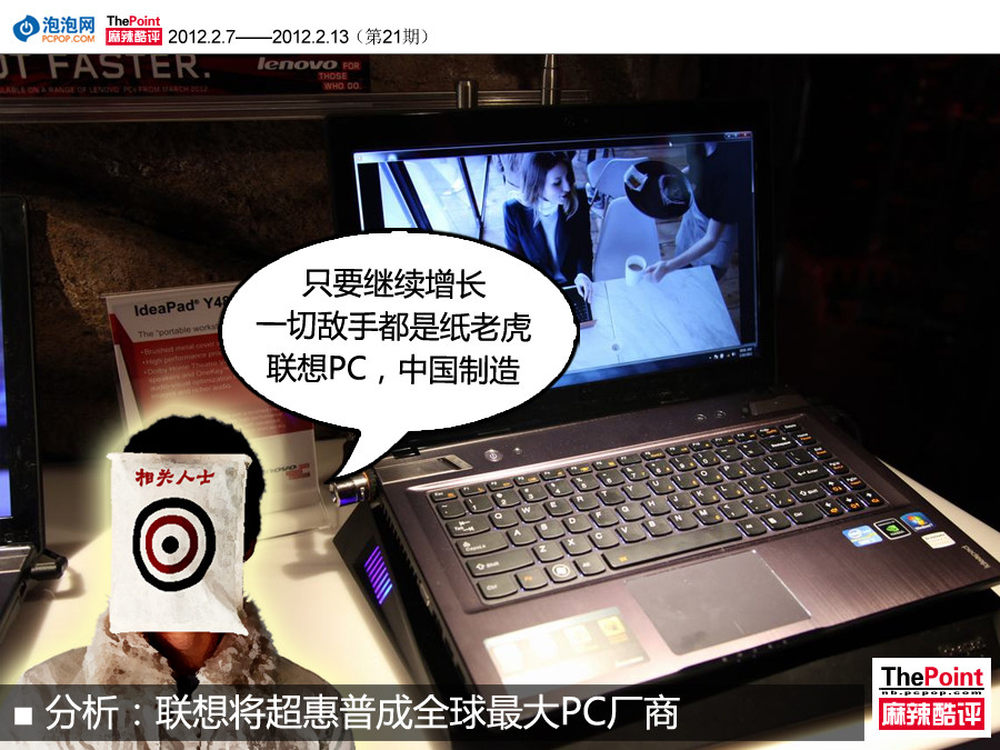 据相关媒体报道,继联想上周公布2011财年第三季度财报之后,分析人士表示继续增长的联想将有望超越惠普,成为全球第一大PC厂商。截止2011年12月31日,联想PC占全球出货量的14%%,占中国出货量的35.3%%。同时该分析师还表示,实际上在全球消费台式机市场上,联想已排在首位,而在商用笔记本市场,其也居于领先位置。4/8