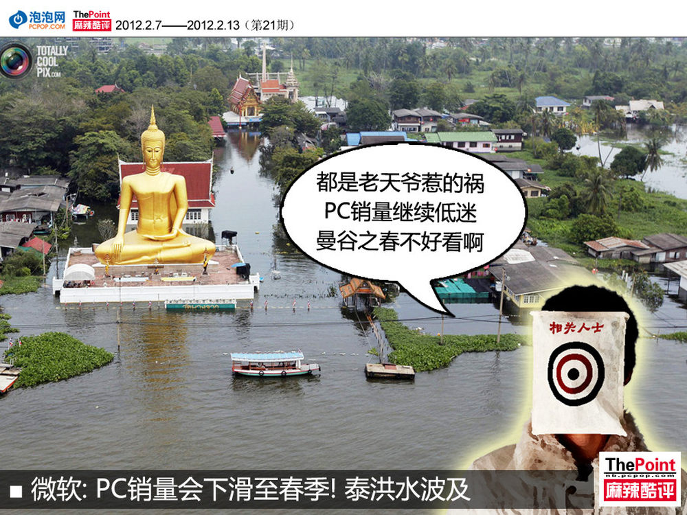 据国外媒体报道,微软高管日前曾表示,PC销量将会继续下滑至今年春季。对此业内分析人士表示,泰国洪水致电脑组件供应减少,是导致该现象产生的重要原因。“这次泰国的洪水对电脑市场影响很大,这种影响今年第一季度仍会存在。”微软投资关系经理Koefoed说道。此外,他还预计今年第一季度,PC市场还会以近10%%的速度下滑。(具体分析请看:http://www.pcpop.com/doc/0/761/761663.shtml)5/8