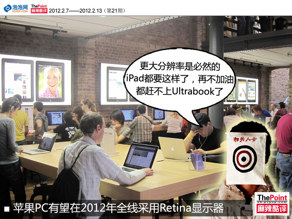 据国外媒体报道,苹果PC有望在2012年全线采用Retina显示器。该消息是业内人士在综合iPad 3以及iPhone、iPod等设备陆续配备该屏幕,以及苹果方面要求应用开发者开发应用时必须上传高清截图等信息后,分析得出的。同时,在Mac OS X 10.7.3更新中,苹果部分UI资源也已替换成了分辨率更高的图片,而早在去年的OS X Lion测试版中,也有网友曝曾出现分辨率达到3200?2000的壁纸。(还有哪些迹象呢?请看:http://www.pcpop.com/doc/0/762/762213.shtml)7/8
