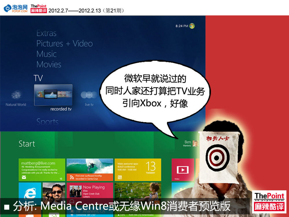 据国外媒体报道,微软或已经选择在Windows 8用户预览版上砍掉Media Center。据悉,在2011年9月的BUILD大会上微软曾在开发者预览版移除了该软件,并表示:“Media Center将不会是测试版(会不会就是指现在的用户预览版)的一部分。”对此业内人士补充表示,Media Center应该还是会安装在Win8正式版中的,不过不同的是,Windows 8版Media Center会为不同的爱好者分离出一个或多个版本。毕竟,微软TV战略已逐步转移到Xbox,现有Media Center产品无缘大多数Windows 8版本。