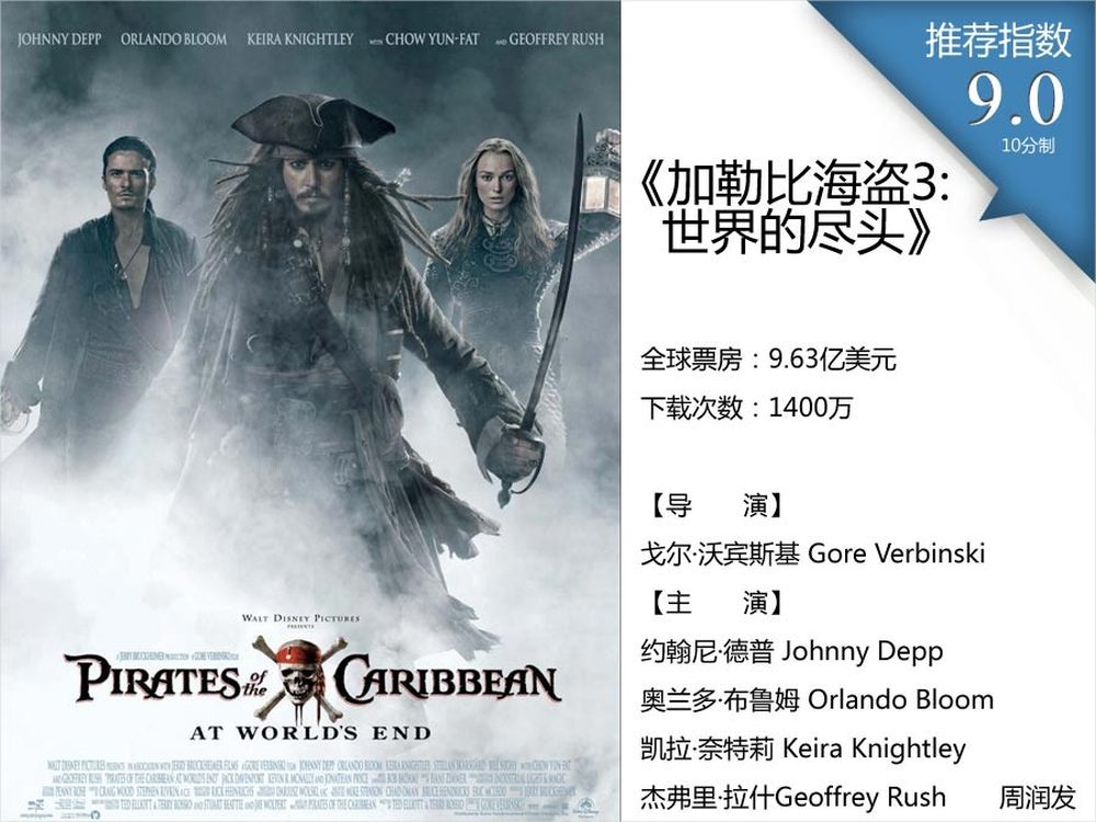 最有看头的不外乎是海盗和蜘蛛谁登峰顶。 只要谨记一点:让海盗再度风靡世界的,不是横行霸道的八爪章鱼怪,而是咱们玉树临风英勇神武扮相前卫涂脂抹粉的杰克船长,《加勒比海盗3》就保管继续赚得人仰马翻!不是咱迷人的杰克自恋,这肆虐海域的海贼冒险记本来就是众星捧月的场面。要不,怎么连帅得冒泡的小铁匠奥兰多?布鲁姆、奥斯卡光环加身的英伦玫瑰凯拉?奈特莉、月光骷髅船长和不败恐怖海魔也抢不了油腔滑调的杰克船长的风头? 挂好了这道金字招牌,号称海盗终章的“世界尽头”之旅就将开航!更加宏大复杂的视效,更多形形色色的海贼王,连片长也冲