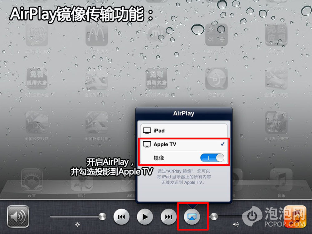 AirPlay是一项全新的无线传输技术,目前已在多款设备上推广使用,iOS设备升级至4.2以上系统版本,都将支持AirPlay功能。我们可以通过手中的iOS设备,利用AirPlay功能将iPad影像画面实时传输到Apple TV中,实现更加宽广清晰地显示效果。15/16
