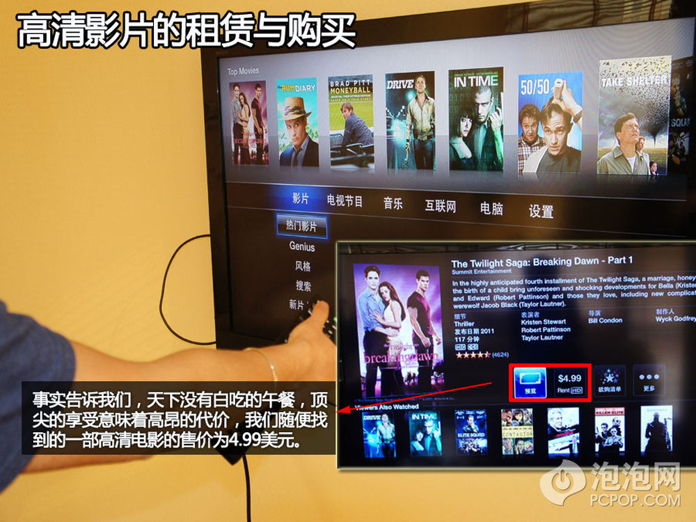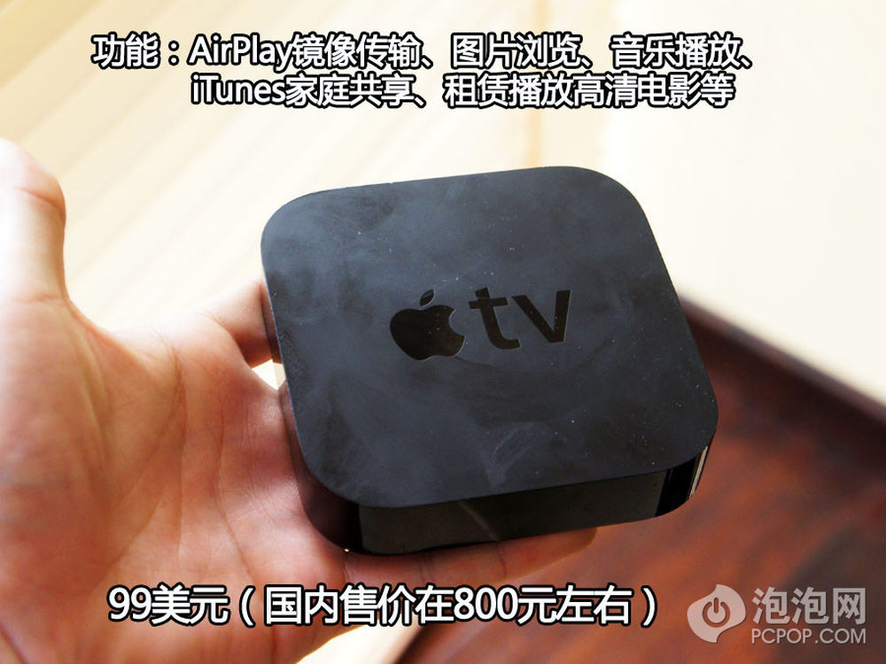 大家一定对这款机顶盒到底是用来干什么的非常感兴趣。苹果Apple TV可以使用内置WiFi或是有线上网功能进行数据交换,通过HDMI将影像传输到高清电视中,呈现给我们完美细腻的高清画面,同时我们还可以通过iTunes家庭共享等功能,在机顶盒上进行浏览、播放等操作,最重要的就是该机顶盒通过iTunes Store可以购买租赁大量影片,价格方面当然也是相当不菲。另外,我们也可以利用手中的iOS设备使用AirPlay功能进行镜像传输,将iPad当中的画面直接搬移到电视当中,视频、图片都能够相当清晰的呈现在我们面前。Apple TV的售价为99美元,国内售价约为800元人民币。另外,Apple TV和我们国内正在使用的机顶盒模式并不相同,所以并不支持国内电视台的节目播放。5/16