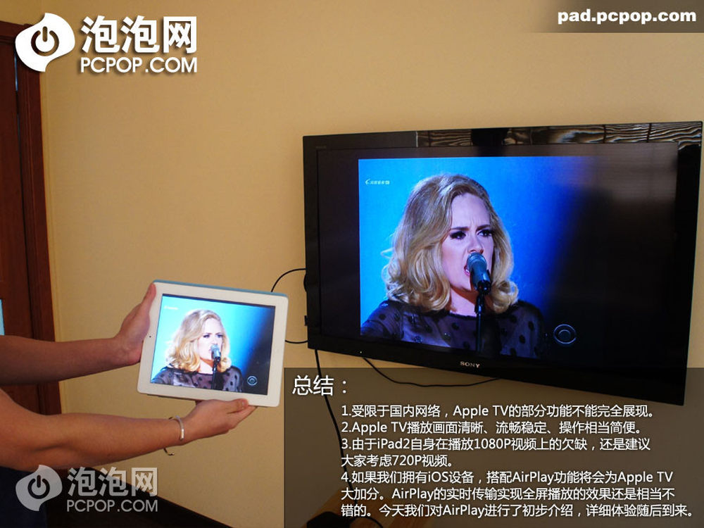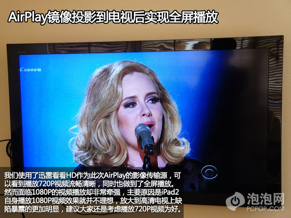 通过测试,我们可以使用AirPlay功能将720P视频无缝传输到高清HDTV上,并且实现全屏播放,效果相当不错。但一同参加测试的1080P视频则不太给力,卡顿现象严重,关键还是由于播放媒体源iPad2本身在1080P视频播放上的效果就并不理想。16/16