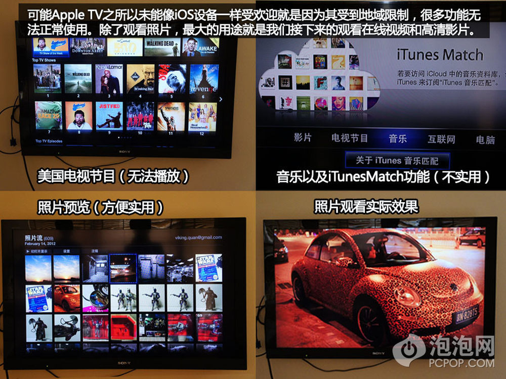 其他方面的体验就不尽如人意了,由于地域、网络的限制,苹果Apple TV的强大功能缩水不少,像电视节目、互联网等功能都无法正常使用,同时音乐功能也要依托每年24.99美元的iTunes Macth支撑。但是照片浏览却是一项相当值得推荐的功能,我们通过iTunes照片流将照片共享到家庭资料库中,这样就可以通过高清电视与家人一同分享快乐时光了。12/16