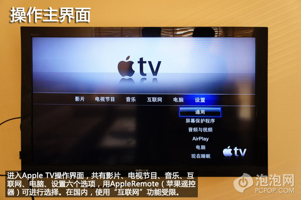 进入Apple TV操作界面,我们会看到共有六大选项供我们选择,分别为电影、电视节目、音乐、互联网、电脑、设置。8/16