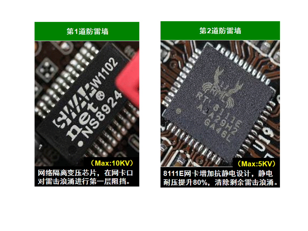 EVO防雷主板分别在主板网口和网卡芯片设了两道防雷墙。雷电发生时候,网线里产生了剧烈的浪涌波动,当浪涌波动过来时,第一道防雷墙将对其进行分析和识别,并在确认浪涌的瞬间将其输送到地线区。如果依旧有残留的电压和逃逸雷电,那第二道防雷墙则会严阵以待的关照它们,确保网卡以及主机板其它部件不被浪涌损坏。
