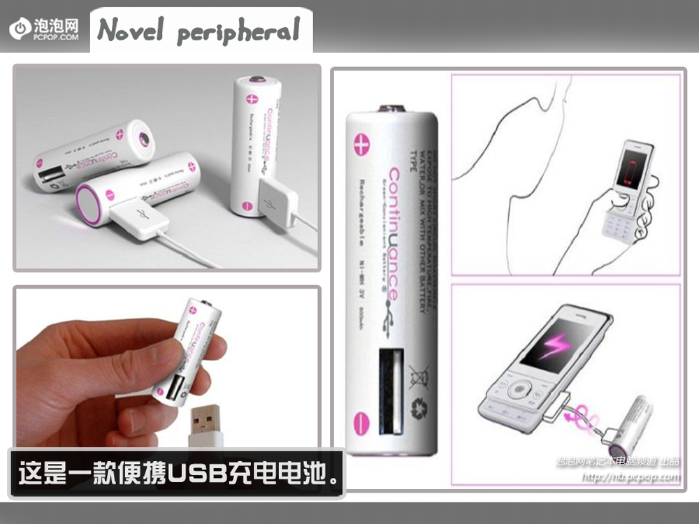 越来越多的电子产品都使用USB接口进行充电,但是在外出时想要找到可以充电的USB插口却不是那么方便。这款充电电池体积小巧,特别带有USB插口,可以随身携带随时随地为手机等设备补充电量。虽然这款电池目前仍处于概念产品的阶段,但是它为满足人们的日常需求提供了一种创新性的解决思路,非常值得借鉴。6/12