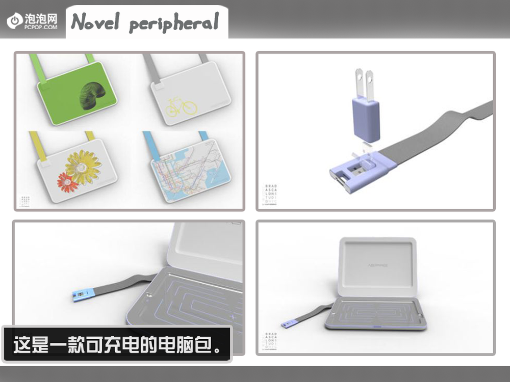 这款电脑包造型简约时尚,外观可以更换,最大的亮点在于它还备有无线充电系统。它的包体本身就是一只大型的充电器,背包带子则是电源插头与USB接口。只需将电源插头与插座相接,或将USB接口与其他电脑相连,这只背包就可以用来为电脑充电,非常方便实用。除此之外,该电脑包(内置存储系统)还可以当作硬盘使用,能够通过USB接口实现与其他设备之间的数据传输。10/12