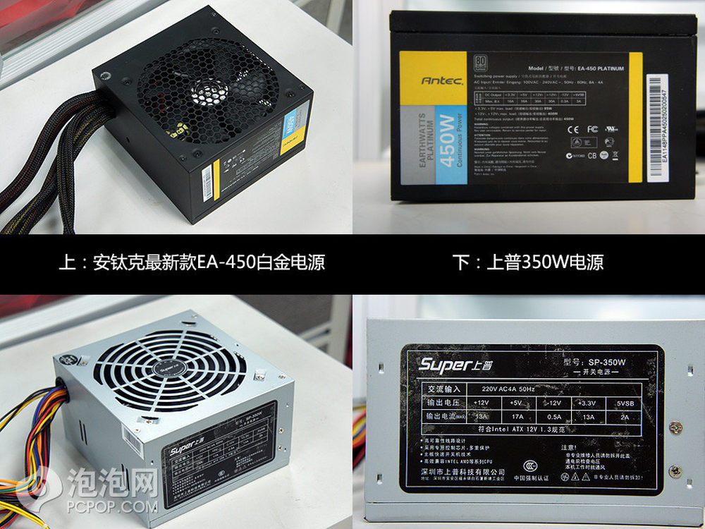 电源方面,我们选择了两款差距比较大的产品。一款是安钛克最新款的450瓦白金牌电源,售价110美金,一款是一个不知名品牌的350瓦电源,售价70块人民币。4/9