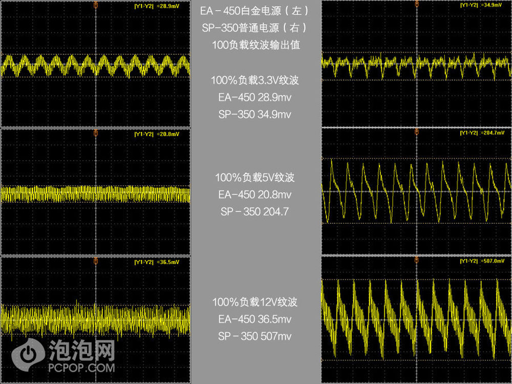 这是我们在电子负载仪上测试的两款电源的纹波输出值。根据Intel制定的电源规范,一颗电源在100%负载时的纹波数值为3.3V不能超过50mv,5V不能超过50mv,12V不能超过120mv。