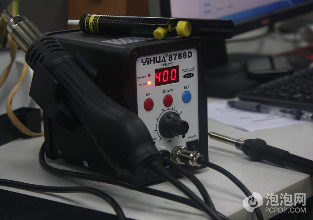 还好两片PCB之间的空隙电烙铁和吸锡器可以勉强放进去。