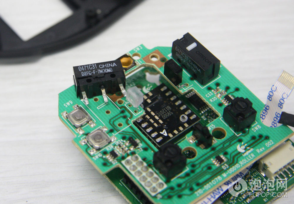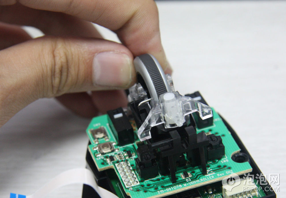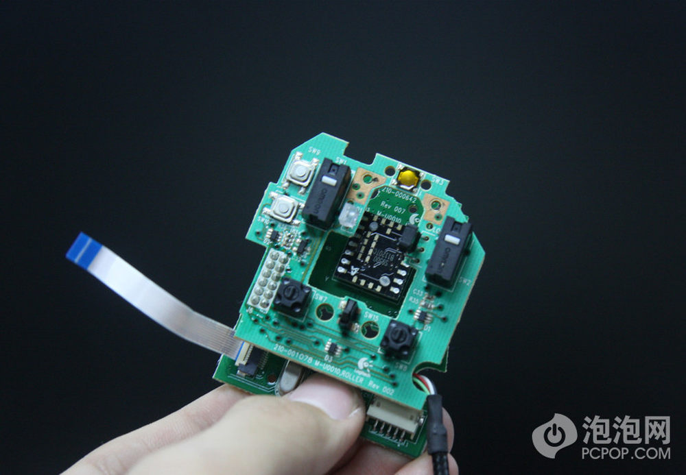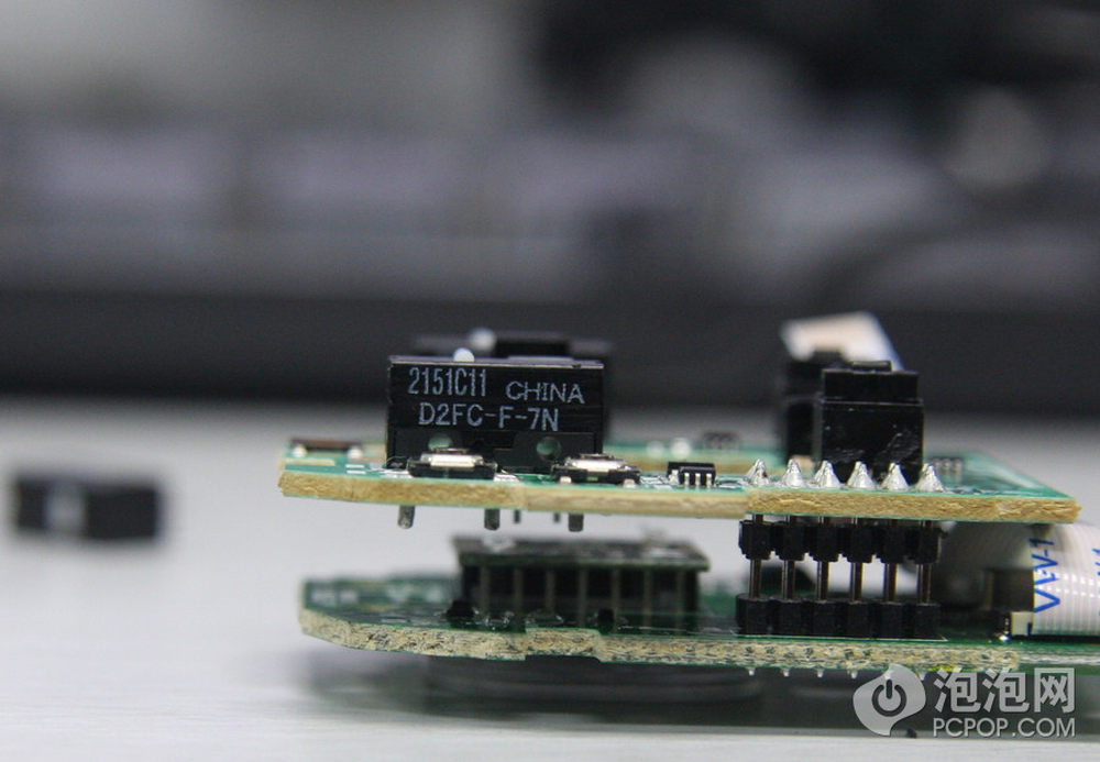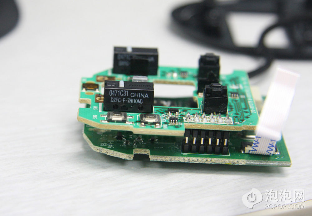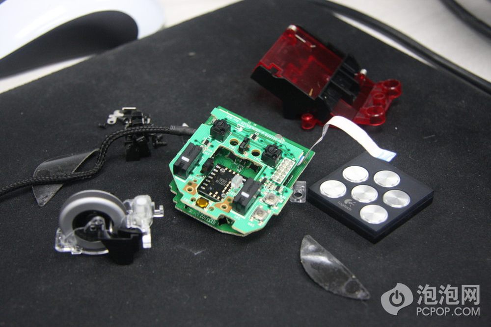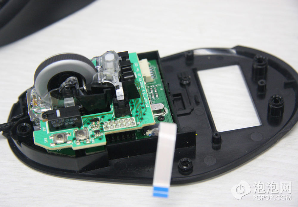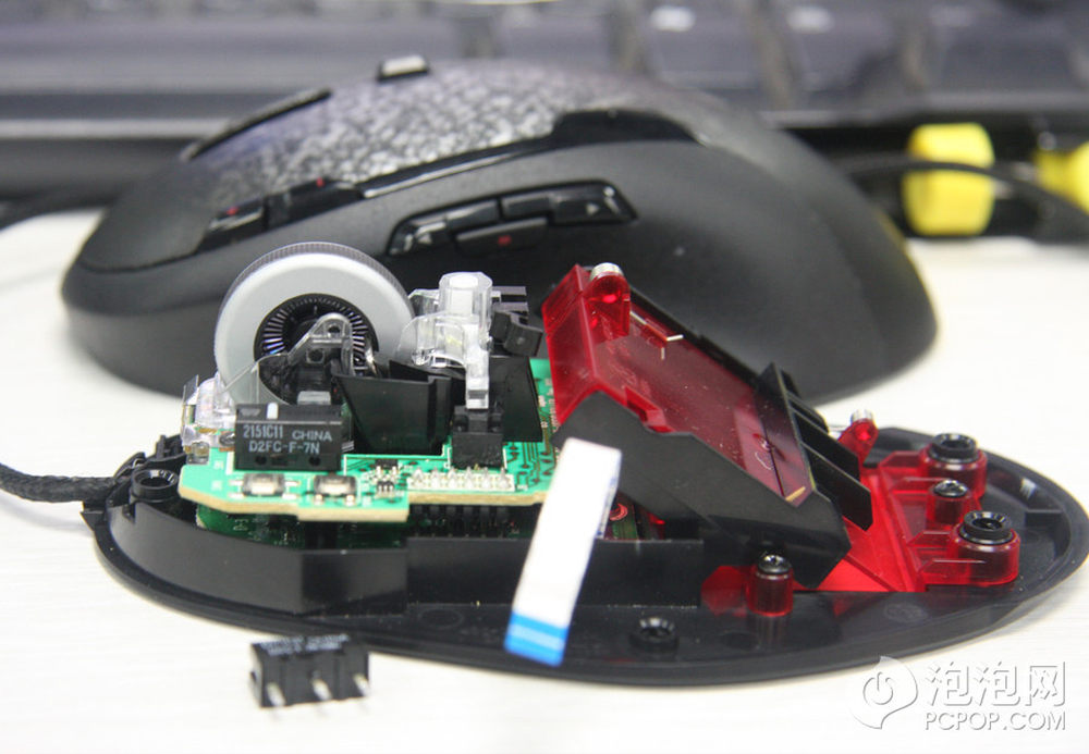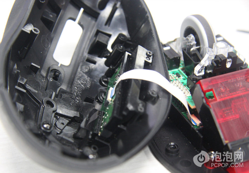 打开上盖,注意鼠标侧键使用过一条排线与PCB连接的,此时不要生拉硬拽,应该先仔细拆掉排线。
