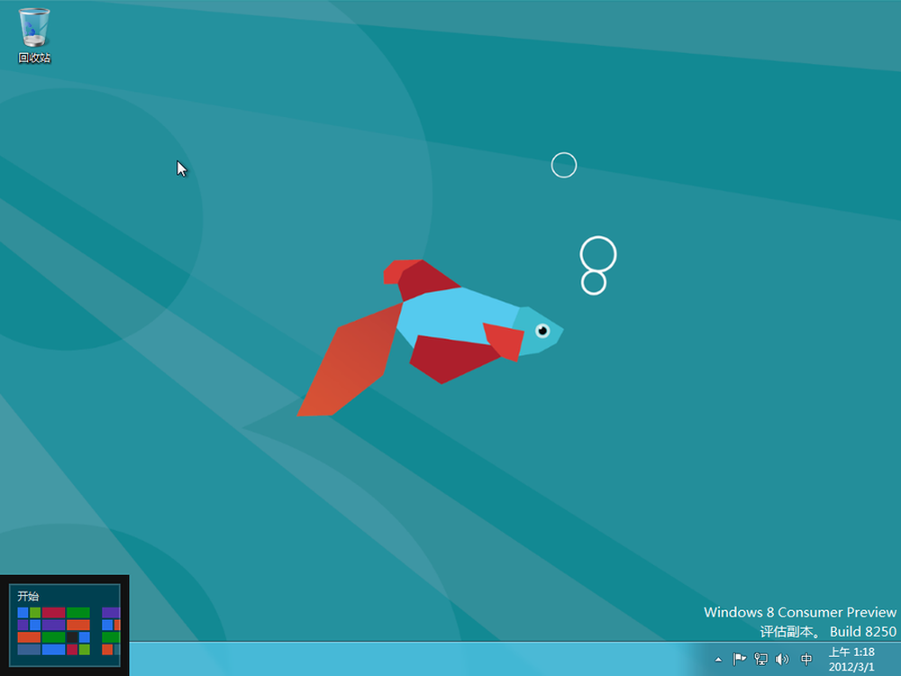开机画面仍然是那条吐泡泡的金鱼,可惜的是测试版Windows 8吐泡泡的过程并没有实现动画效果,而只是简单的一张图片而已。10/29