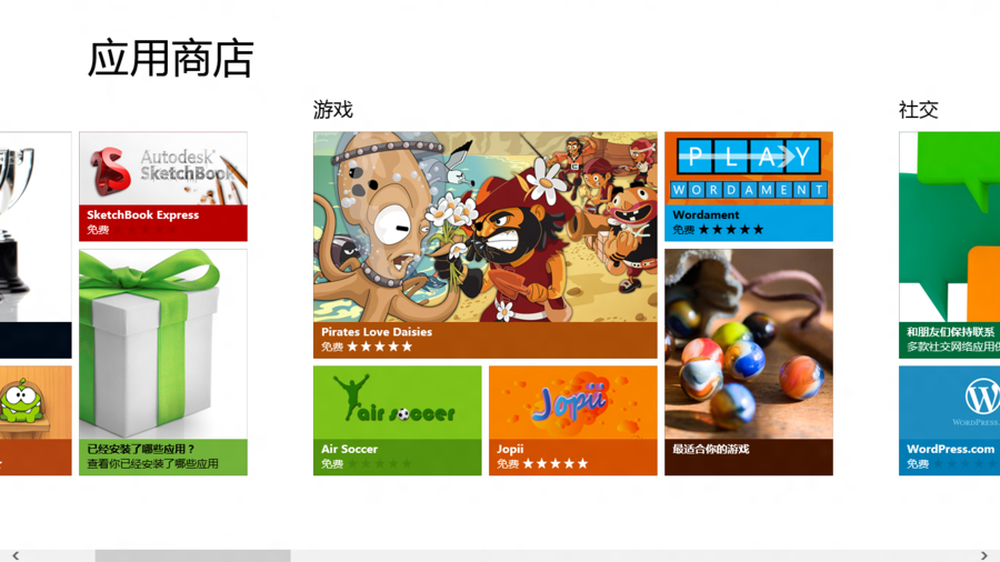 WIN8的最大改进是加入了在线商店,在这里你可以找到丰富的应用程序和游戏。目前在线商店全免费哦,各位抓紧了。22/29