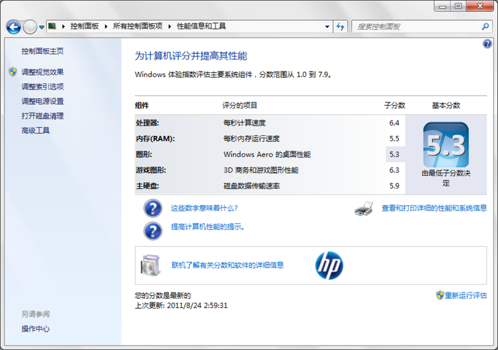 这张图中的得分为同一台电脑在WIN7下的得分。我们发现其得分为5.3分。主要比WIN8CP高在了显示性能上面。但是CPU性能却不及WIN8CP。26/29