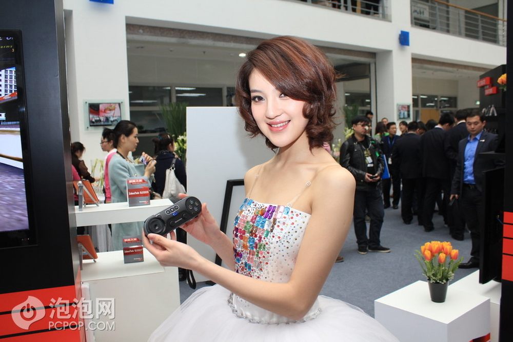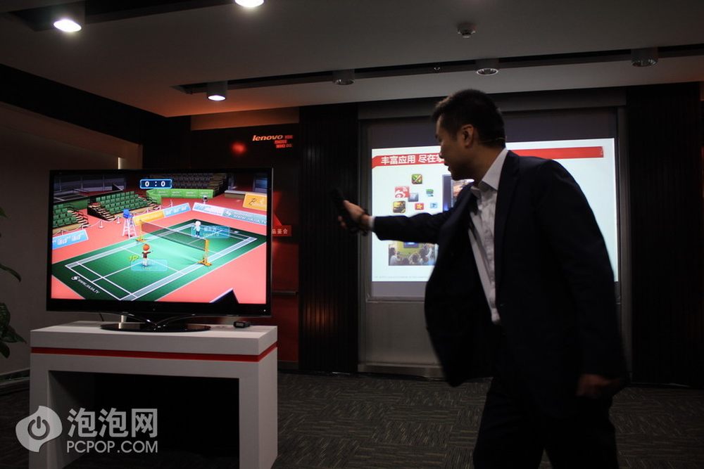 前文提到过K91系列的遥控器还可以在游戏的时候充当体感控制器。图为联想集团高级副总裁、中国区总裁陈旭东先生在演示羽毛球游戏。23/27
