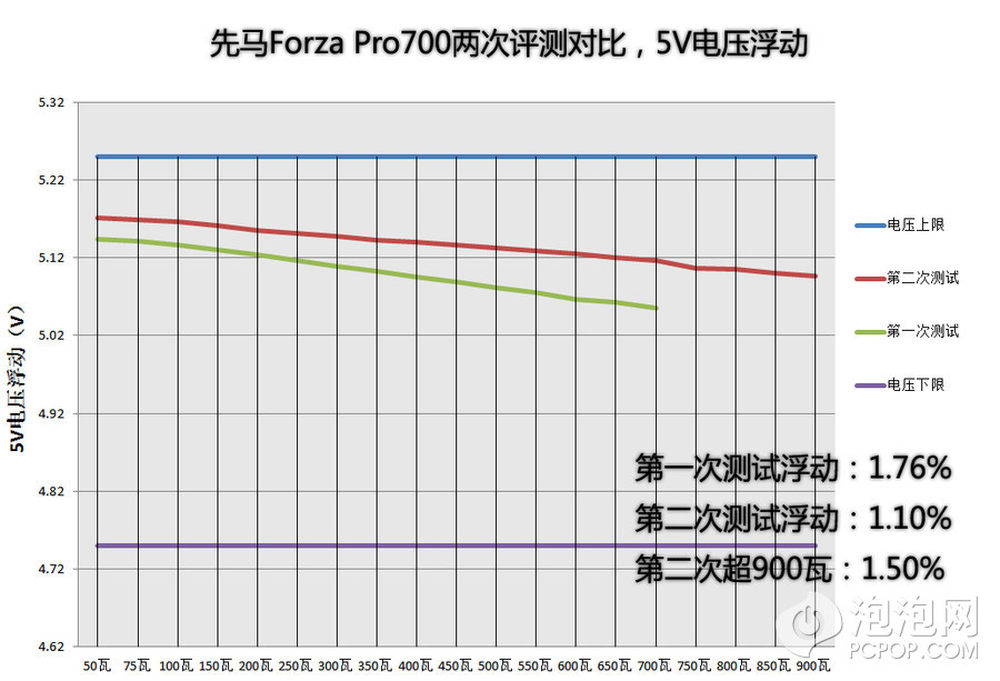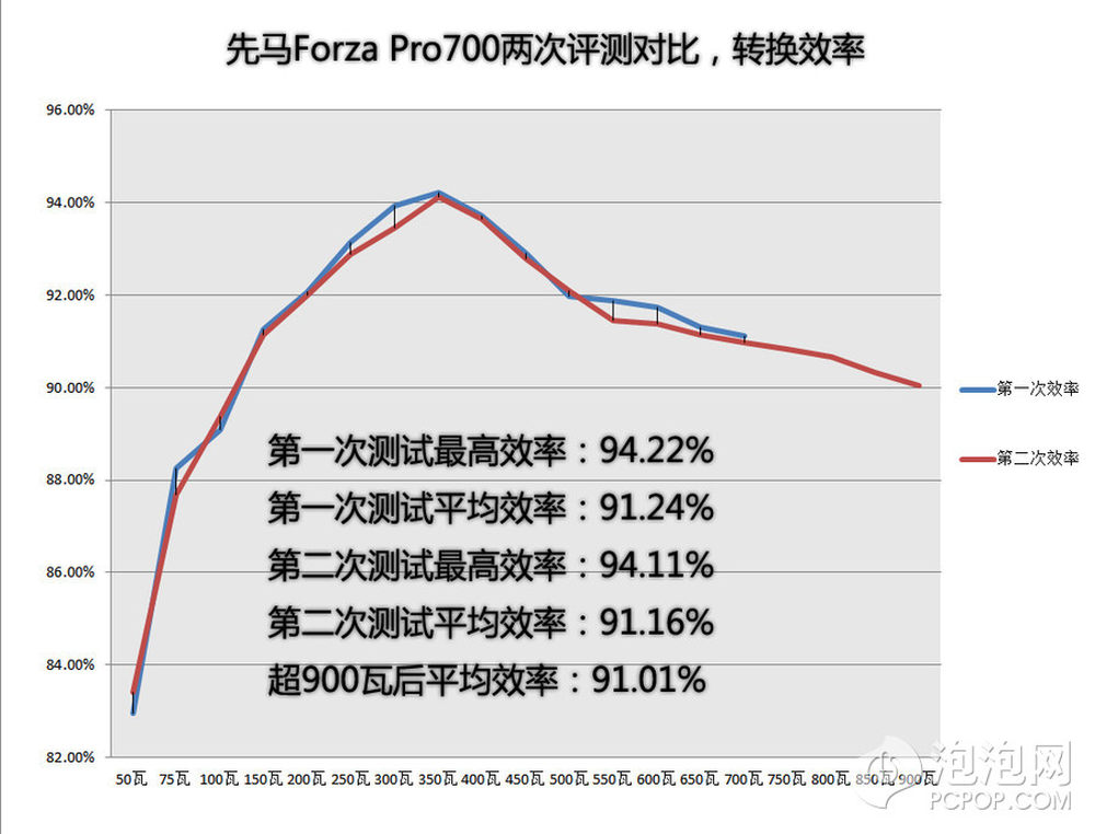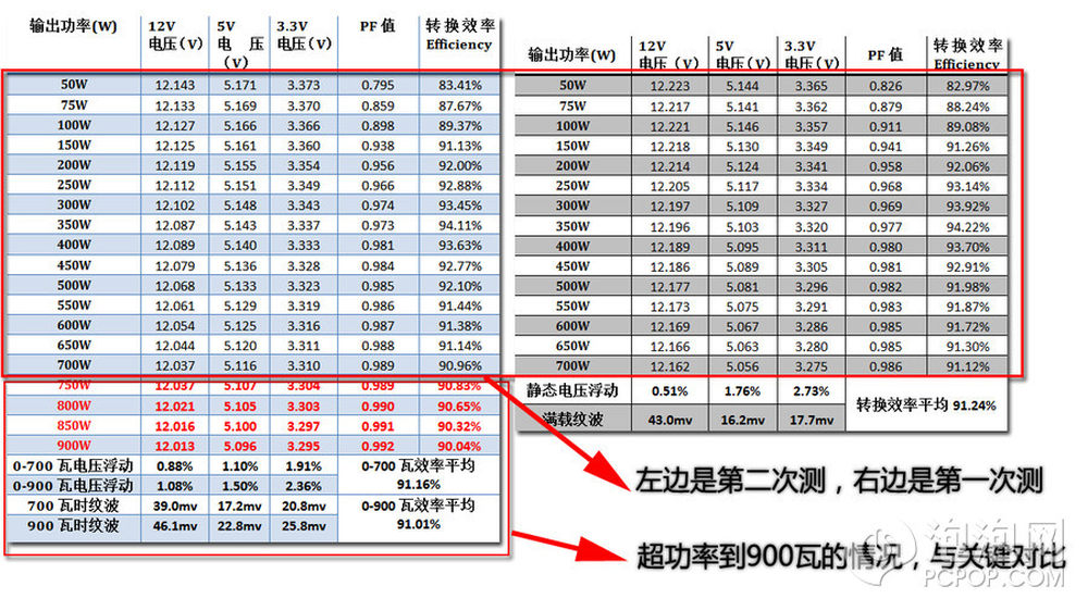 值得一提的是第二次测试我们把负载加高到了900瓦,超过这颗电源额定功率的29%%,但是工作依然正常,各路电压浮动很小,纹波没有显著增长,最历害的是转换效率也没有跌落到90%%以下,通过测试的数据看这颗电源在负载较高时转换效率下降的很少,这一点不容易。6/17