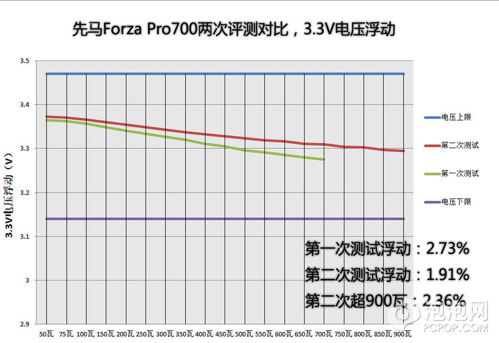 第二次测试时12V的纹波略有下降,5V和3.3V略有升高,不过在900瓦负载下,不论是刚才看到的3路电压变化还是纹波峰峰值的变化都非常小。