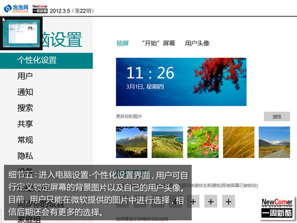 此前,小编曾预计Win8消费者预览版肯定会为用户提供锁屏界面的壁纸资源,结果,还真是,哈哈!7/14