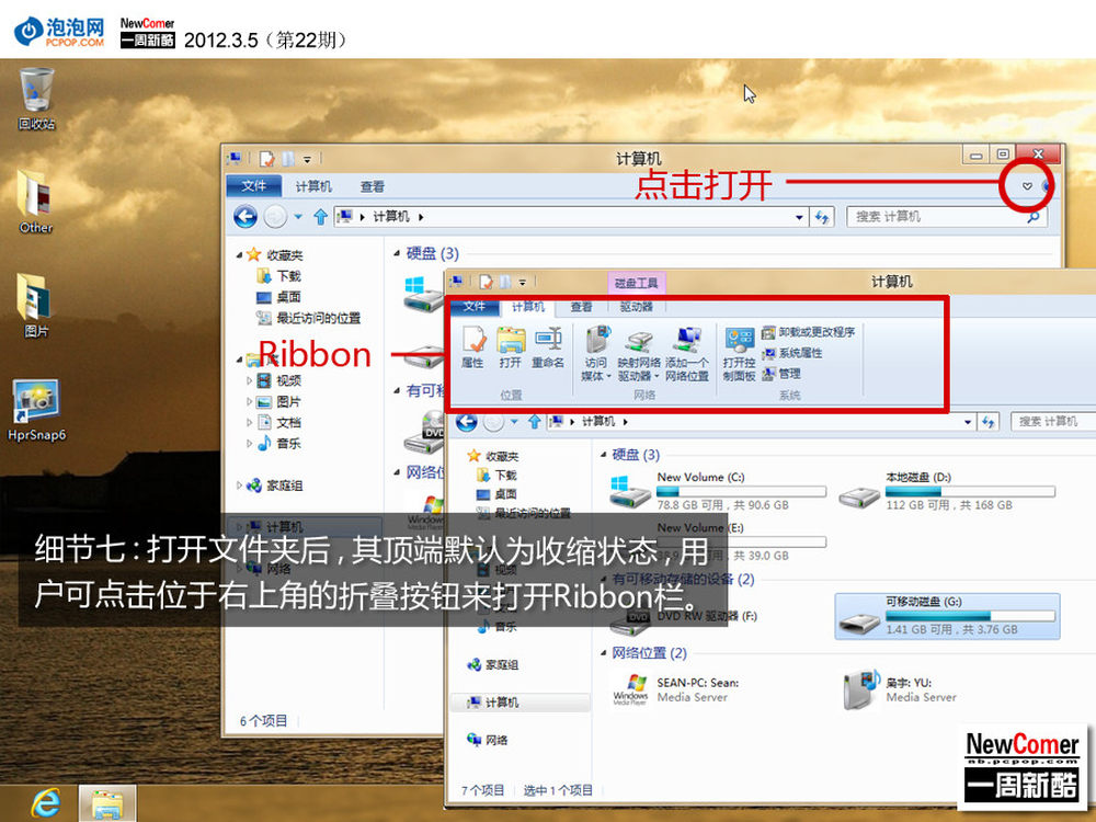文件夹打开时,其顶端默认保持传统界面样式,但点击位于右上角的折叠按钮后,便可打开Ribbon界面。9/14