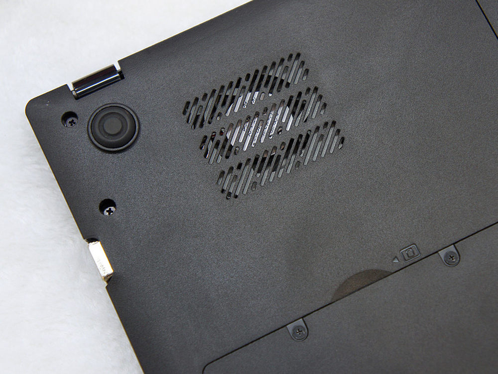 在机身底部可以看到散热风扇,尺寸上比较小,不过从摸上去的温度来看,散热风扇的散热压力不是很大。15/23