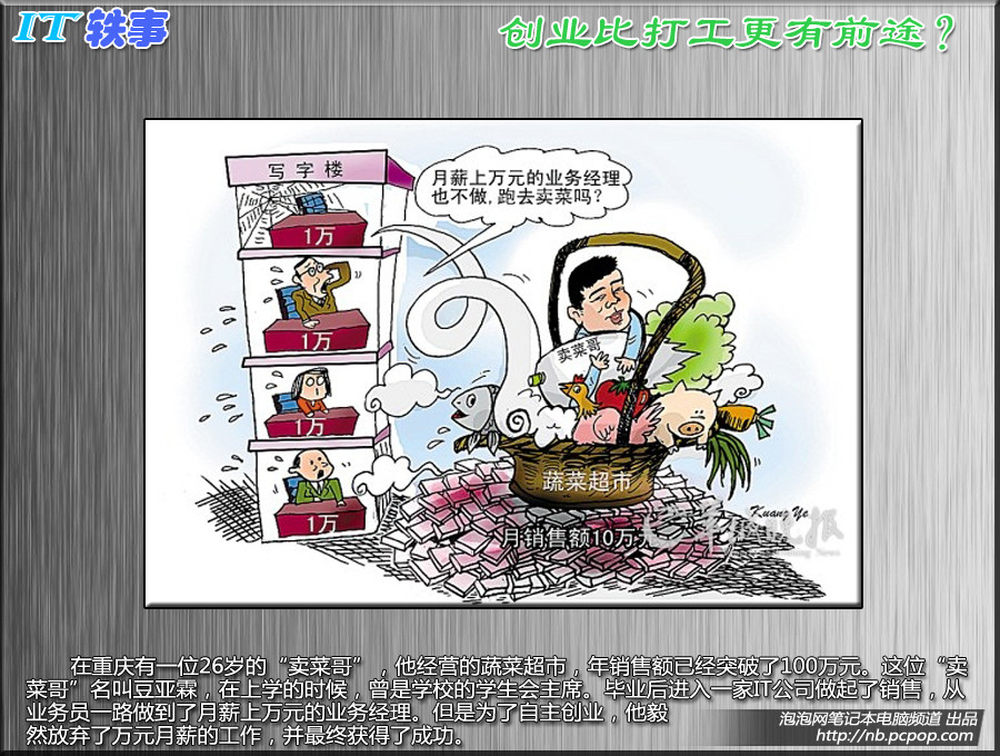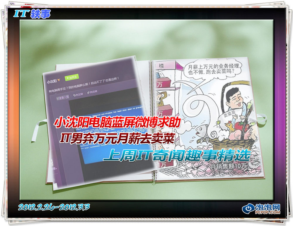 最新一期的IT轶事又和大家见面了,上周的IT圈子也闹出了不少笑话:娱乐明星小沈阳的电脑突然蓝屏死机后在自己的微博上求助,顿时遭来网友的围观和各种出谋划策,也有网友说小沈阳这么有钱为什么不直接换一台电脑!重庆有一名IT男弃万元月薪去卖菜,最后终于创业成功。其它精彩内容请看详细文章。 2/15