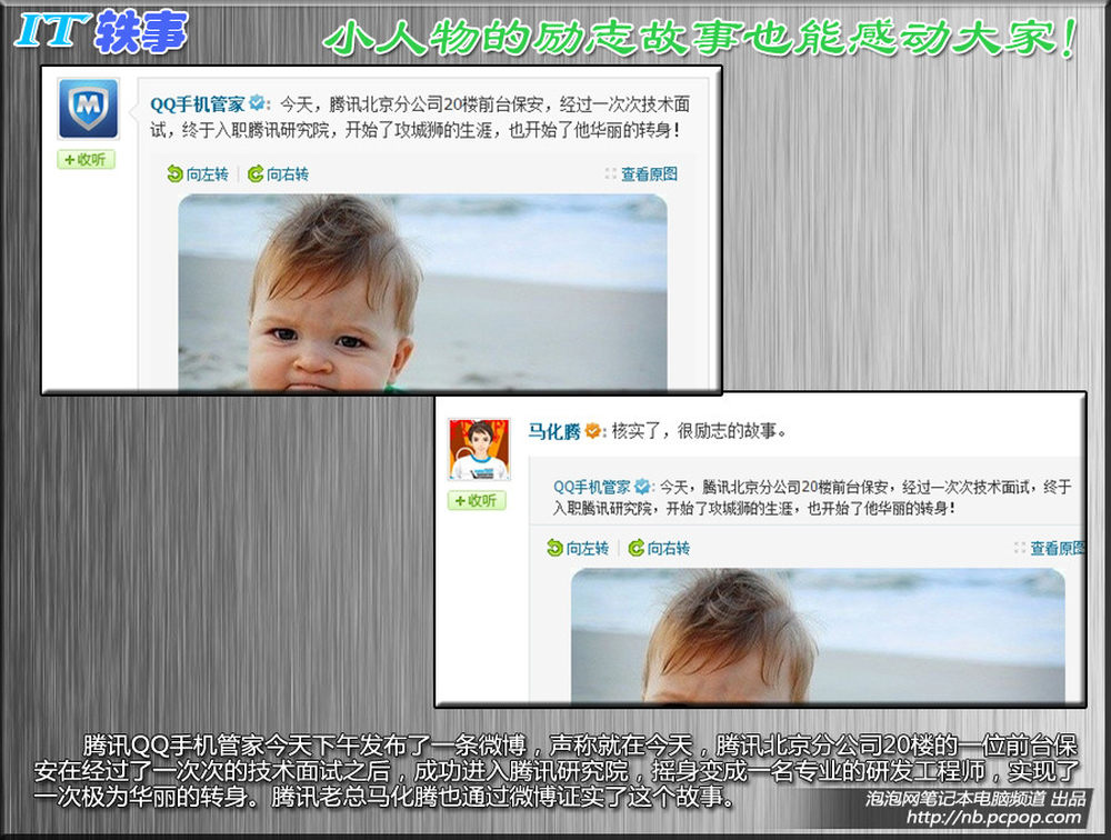 腾讯QQ手机管家今天下午发布了一条微博,声称就在今天,腾讯北京分公司20楼的一位前台保安在经过了一次次的技术面试之后,成功进入腾讯研究院,摇身变成一名专业的研发工程师,实现了一次极为华丽的转身。腾讯老总马化腾也通过微博证实了这个故事。5/15