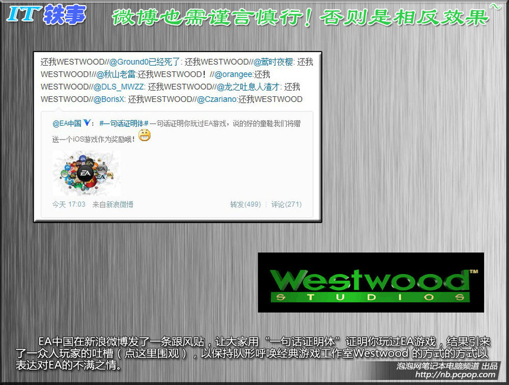 EA中国在新浪微博发了一条跟风贴,让大家用“一句话证明体”证明你玩过EA游戏,结果引来了一众人玩家的吐槽(点这里围观),以保持队形呼唤经典游戏工作室Westwood 的方式的方式以表达对EA的不满之情。6/15