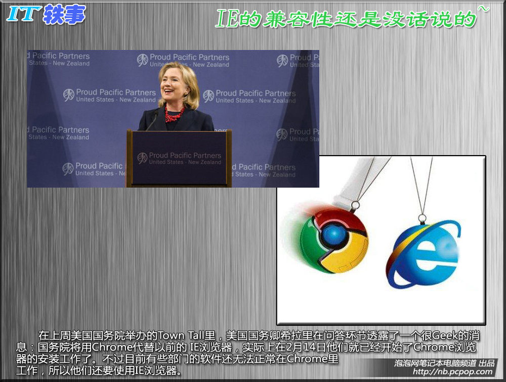 在上周美国国务院举办的Town Tall里,美国国务卿希拉里在问答环节透露了一个很Geek的消息:国务院将用Chrome代替以前的 IE浏览器,实际上在2月14日他们就已经开始了Chrome浏览器的安装工作了。不过目前有些部门的软件还无法正常在Chrome里工作,所以他们还要使用IE浏览器。7/15