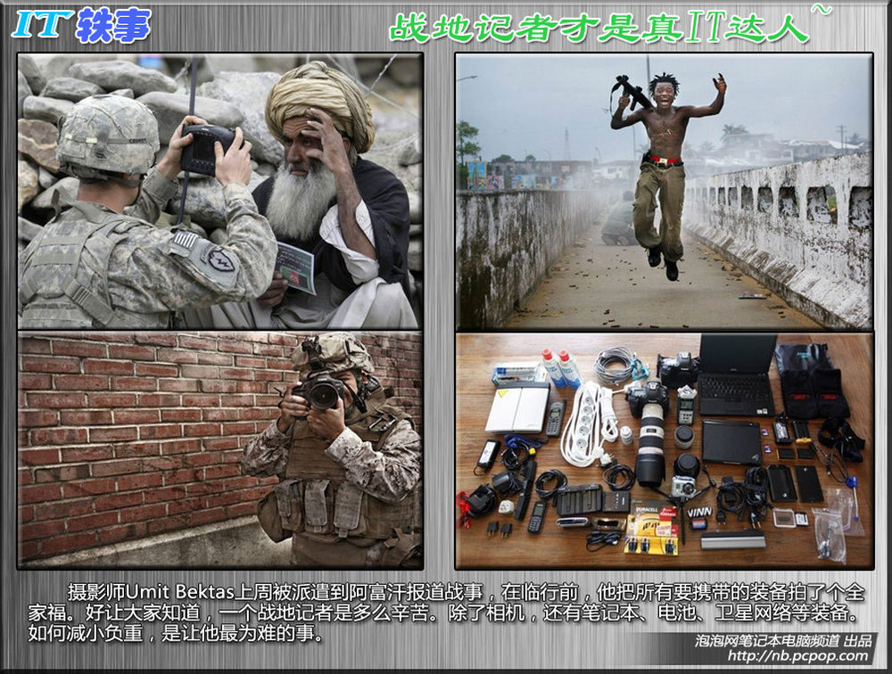 摄影师Umit Bektas上周被派遣到阿富汗报道战事,在临行前,他把所有要携带的装备拍了个全家福。好让大家知道,一个战地记者是多么辛苦。除了相机,还有笔记本、电池、卫星网络等装备。如何减小负重,是让他最为难的事。8/15