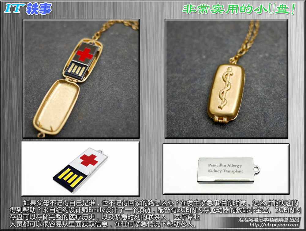 如果父母不记得自己是谁,也不记得回家的路怎么办?在发生紧急事件的时候,怎么才能快速的得到帮助?来自纽约设计师Emily设计了一个项链,配备有2GB的闪存驱动器的救命小金盒。2GB的闪存盘可以存储完整的医疗历史,以及紧急时刻的联系人。医疗专业人员都可以很容易从里面获取信息,在任何紧急情况下帮助老人。这个救命小盒大小为1.25?0.5?0.75,带有镀金链和USB闪存驱动器。它的零售价为170美元。10/15