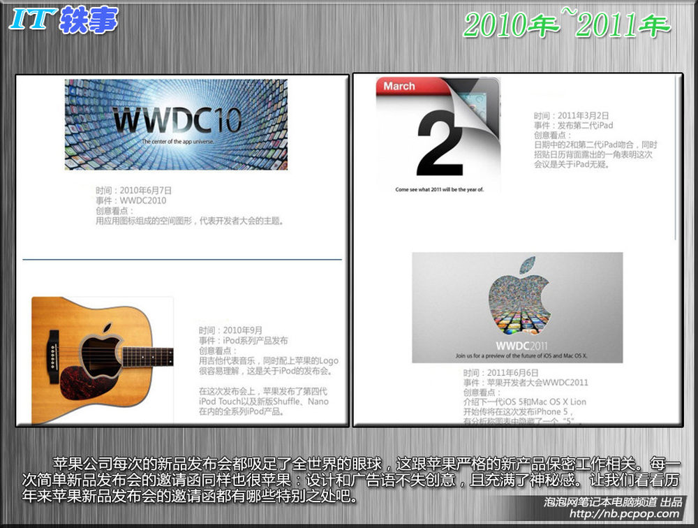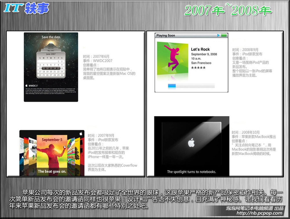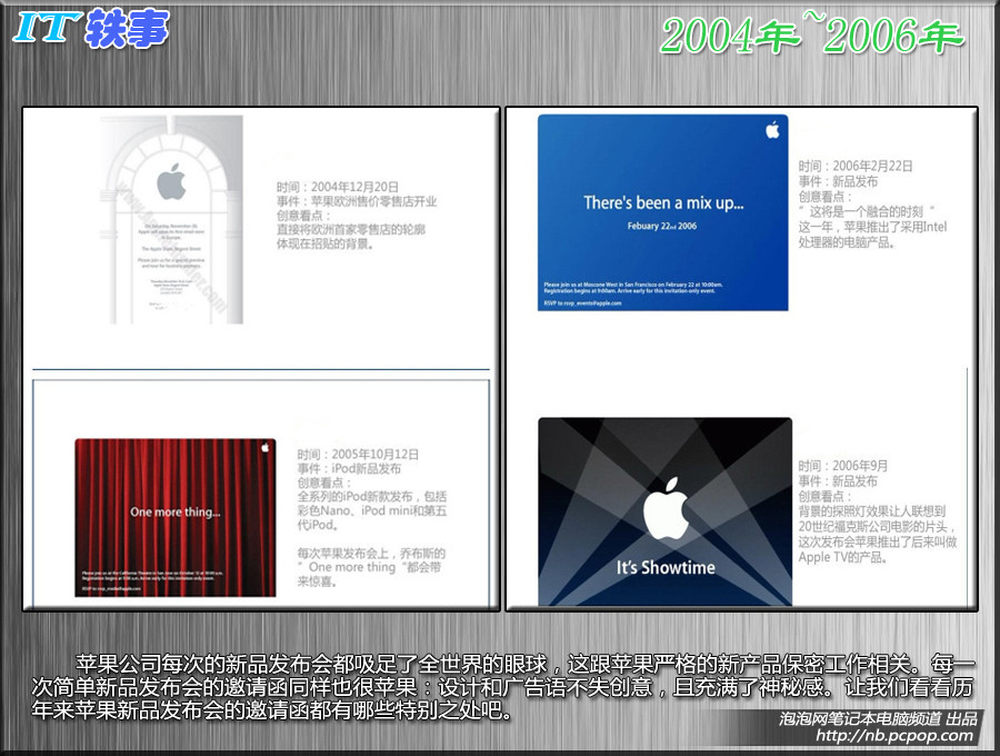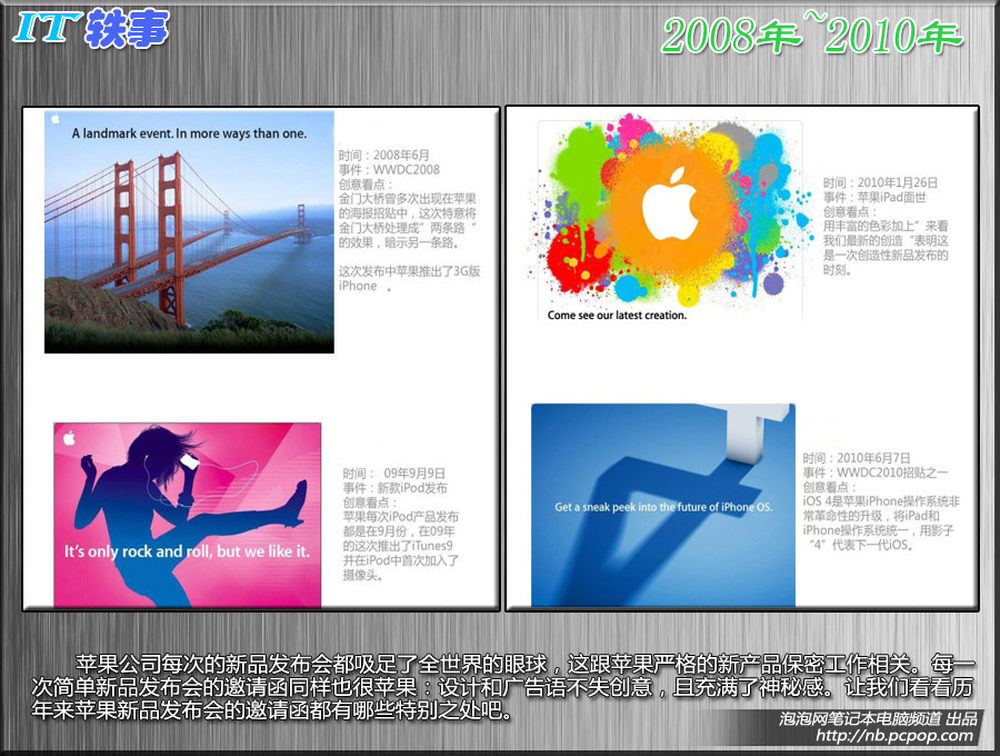 苹果公司每次的新品发布会都吸足了全世界的眼球,这跟苹果严格的新产品保密工作相关。每一次简单新品发布会的邀请函同样也很苹果:设计和广告语不失创意,且充满了神秘感。让我们看看历年来苹果新品发布会的邀请函都有哪些特别之处吧。14/15