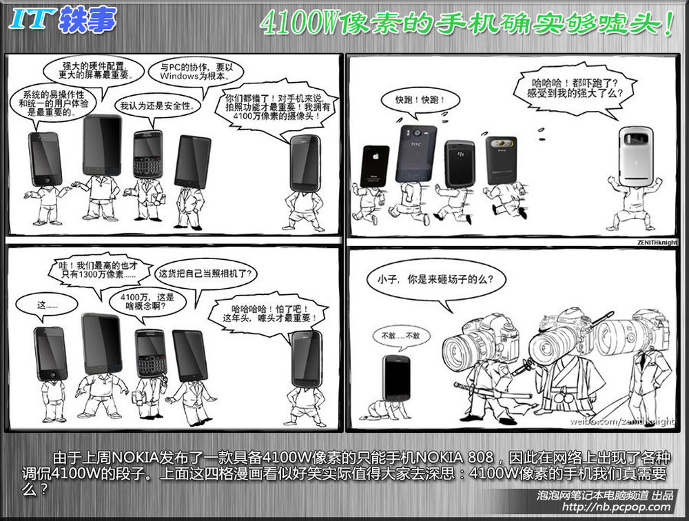 由于上周NOKIA发布了一款具备4100W像素的智能手机NOKIA 808,因此在网络上出现了各种调侃4100W的段子。上面这四格漫画看似好笑实际值得大家去深思:4100W像素的手机我们真需要么?