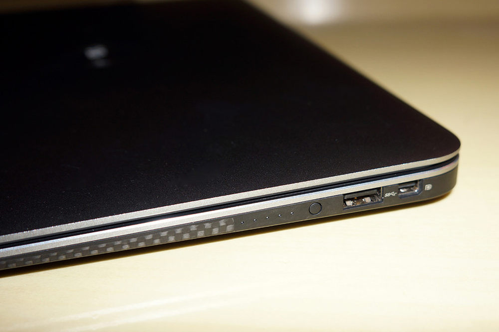 戴尔XPS 13机身右侧接口依次为Mini DP接口、USB 3.0和电池电量指示装置。19/23
