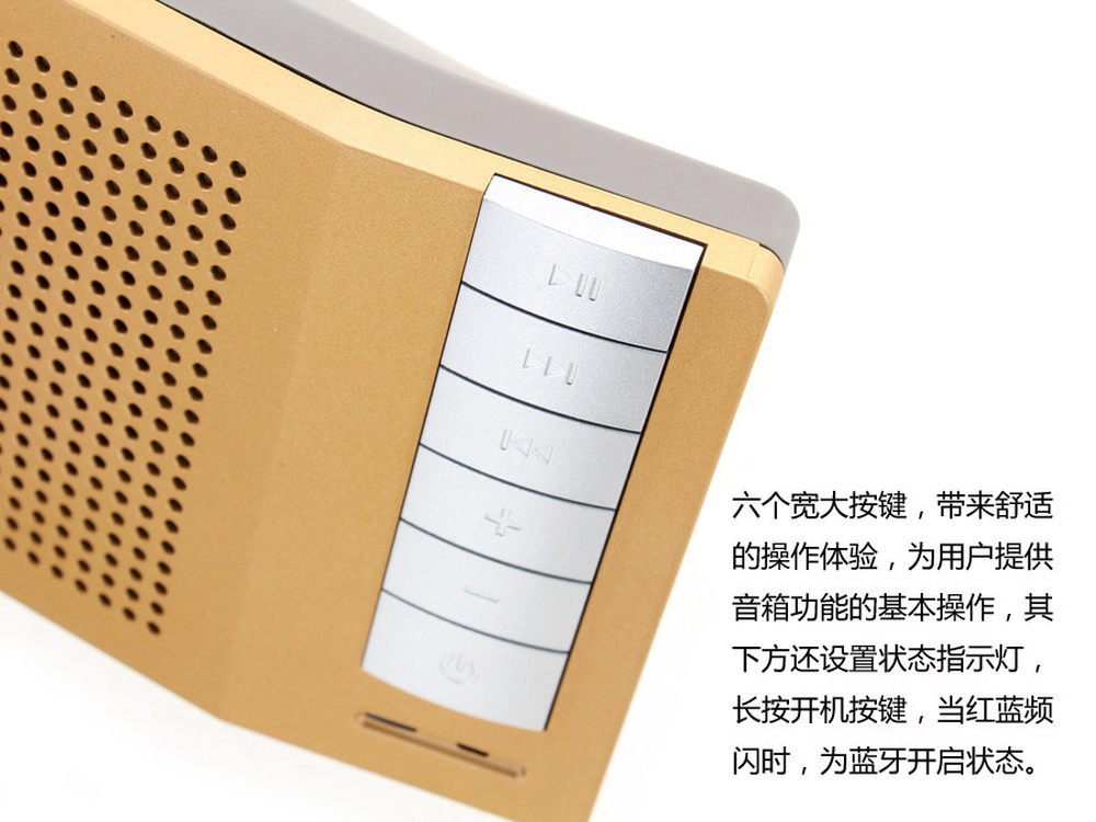 音箱前面板的一侧设置六个宽大舒适的按键,方便人们日常的操作使用。6/8