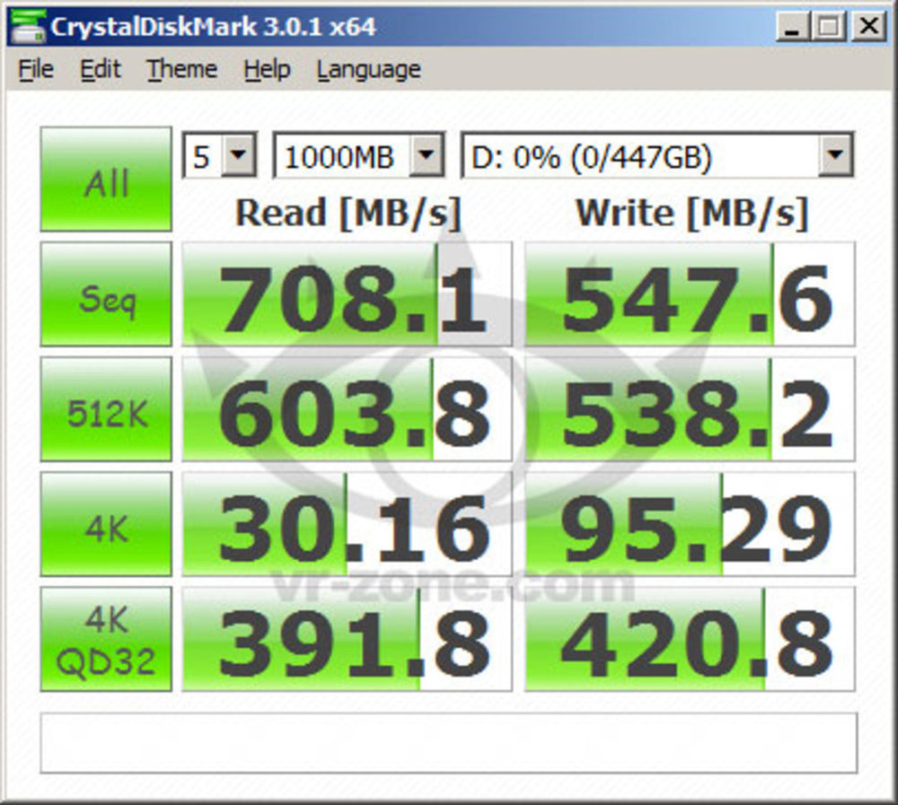 CrystalDiskMark测试持续读写成绩分别为708.1MB/s和547.6MB/s,弱爆了SATA 6Gbps SSD。