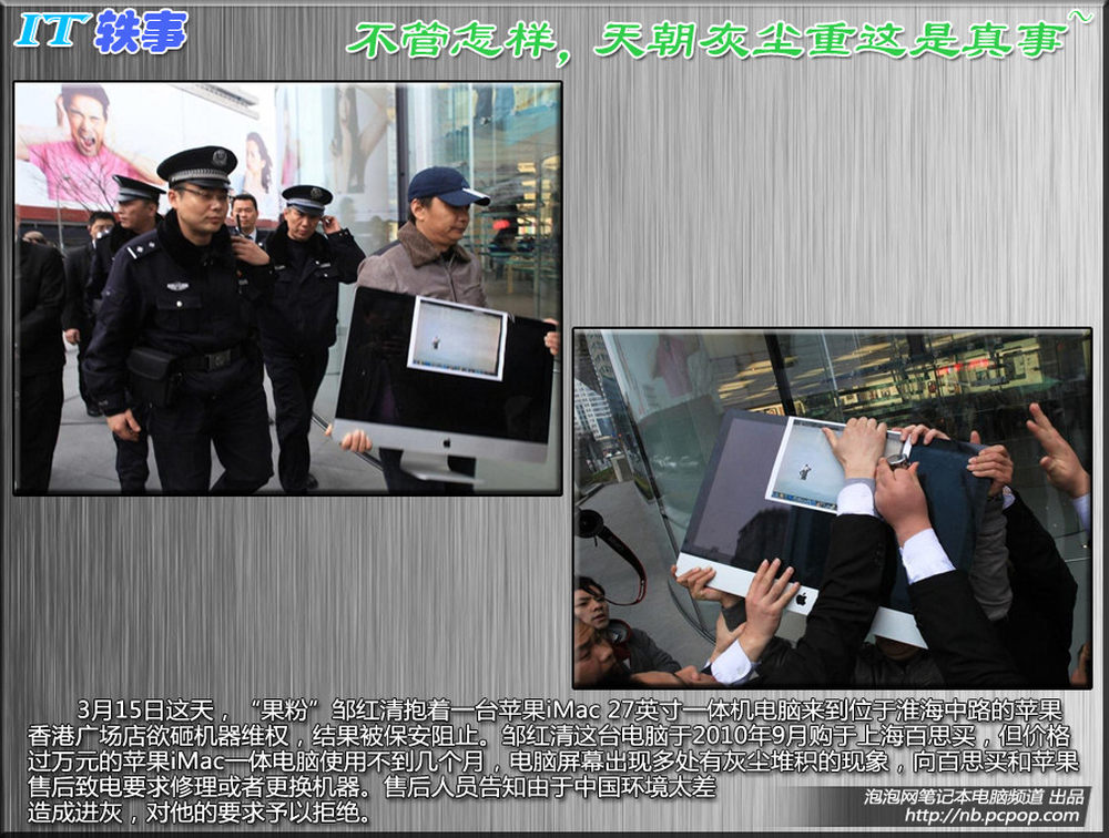 3月15日这天,“果粉”邹红清抱着一台苹果iMac 27英寸一体机电脑来到位于淮海中路的苹果香港广场店欲砸机器维权,结果被保安阻止。邹红清这台电脑于2010年9月购于上海百思买,但价格过万元的苹果iMac一体电脑使用不到几个月,电脑屏幕出现多处有灰尘堆积的现象,向百思买和苹果售后致电要求修理或者更换机器。售后人员告知由于中国环境太差造成进灰,对他的要求予以拒绝。3/10